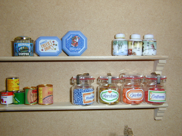 6/12/2007 - Upon request I am adding some pictures of the house in it's "matured" state. These are some pics as you would find the house today, quite full of stuff. Below there has been an addition to the house due to over crowding. Since the house was getting sooo full of stuff we decided to do what every middle class family does, add on. Since the collection of kitchen items was getting pretty extensive, we decided that a general store would be in order. Albeit not quite as labor intensive as the house, this little store did take us quite a bit of time. We still haven't made a little sign for out front. The flooring is actual red oak that has been stained. We were going for that old store look. My two favorite items are the little Maggi bottles and the barrel with the wheat bag. Also, the shelves were custom made by the general contractor/painter (wife).