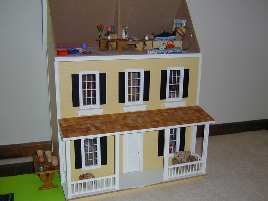 Jan 3, 2006 - Finally, after many hours of painting, we have finished. My wife really worked hard on the paint this past Christmas break, she alone has probably 12 hours of painting in it. Here are the completed pics. All the shingles are on, we even ran out so the hinge on the back didn't get shingles. I tried to get a good picture of the door knob but my camera wouldn't cooperate. I took a nail and polished the head on the drill press so it cleaned it up and now looks like a knob and not a nail head. Then I cut the nail down to size so it fit into the door. The Grandparents have already laid claim to the porch.