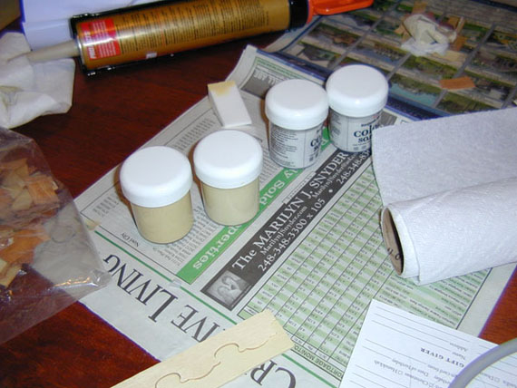 Roof shingles, you got it, they are all separate too. Of course in the kit they are not painted, just plain old pine. I thought for authenticity I would go through the trouble of mixing three batches of stain, each a slightly different color. When we started to stain the pieces I quickly realized that the pieces each looked different in shading, even though they came from the same stain batch. This was due to the fact the stain penetrated differently and each piece had it's own slight natural color variation. Sooooo, on we went for a total of about 3 hours of shingle staining, split into two sessions of course.